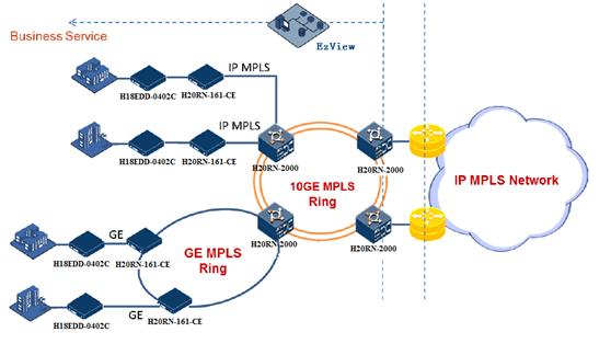 注:图中H20RN-2000、H20RN-161-CE为华环公司IPRAN/IP MPLS设备,H18EDD-0402C为EDD设备, EzView为华环公司EMS网元管理系统。