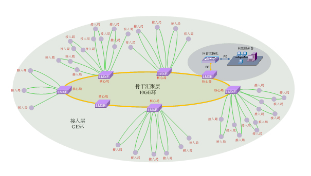 核心局搭建10GE骨干汇聚环,由骨干汇聚环下挂接入局,根据专线分布集中度,布置多个接入局,未来的大客户专线均由接入局接入。接入局与所接入的骨干节点间组成GE接入环网。每段互联的光纤链路经由DWDM设备的波分通道实现。客户网点布置接入设备如智能光纤收发器等,上联对接接入局传输资源,实现专线接入。