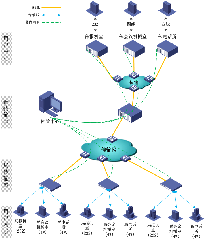 部传输室——部传输室放置一台H9MO-LMXE+.V2设备,这是一款框式设备,完成所有用户网点的业务进行交叉连接的功能,交叉后将业务通过E1分别传输至部报机室、部会议机械室和部电话所。部传输室到各个室的E1可采用1+1保护的方式。
